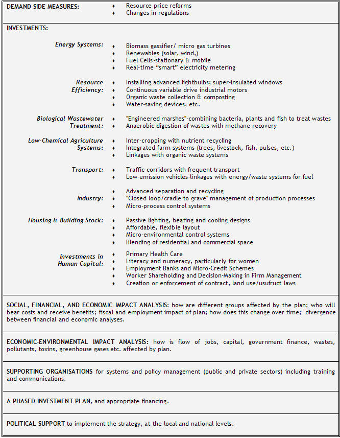While the specific packages of systems, policies, and approaches will vary by region, a regional sustainable development strategy would include a range of elements, suggested below: