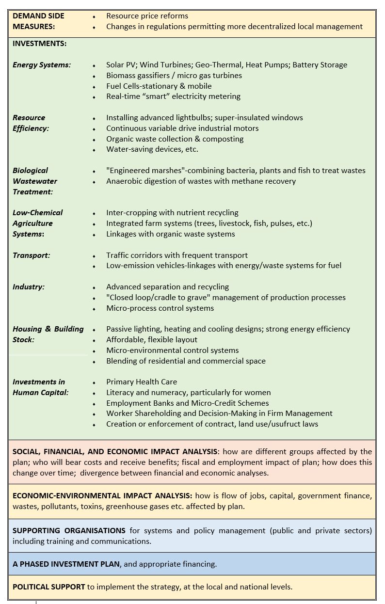 While the specific packages of systems, policies, and approaches will vary by region, a regional sustainable development strategy would include a range of elements, suggested below:
